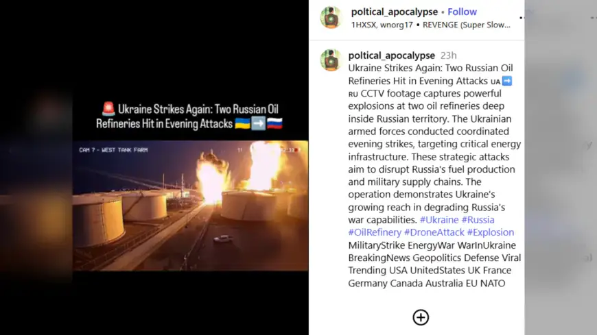 24 मार्च 2026 को इंस्टाग्राम पर 'poltical_apocalypse' नामक यूजर ने एक वीडियो पोस्ट किया जिसमें चार अलग-अलग सीसीटीवी क्लिप्स का कोलाज है। इसमें रिफाइनरियों में भीषण आग और धमाके दिखाई दे रहे हैं। दावा किया गया कि यह यूक्रेन द्वारा रूसी सीमा के काफी अंदर किए गए रणनीतिक हमलों के वास्तविक फुटेज हैं, जिनका मकसद रूस की सैन्य आपूर्ति श्रृंखला को बाधित करना है। हालांकि, यूक्रेन ने वास्तव में 22 मार्च 2026 को फिनलैंड की सीमा के पास स्थित रूस के प्रिमोर्स्क तेल टर्मिनल और ऊफा शहर की रिफाइनरी पर ड्रोन हमले किए हैं, लेकिन वायरल हो रहा यह विशिष्ट वीडियो उन घटनाओं का नहीं है।