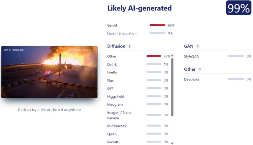 यूक्रेन द्वारा रूस की तेल रिफाइनरियों को निशाना बनाने के दावे के साथ वायरल हो रहा वीडियो असली नहीं है। तकनीकी जांच और फॉरेंसिक एनालिसिस में पुष्टि हुई है कि यह वीडियो एआई (Artificial Intelligence) की मदद से तैयार किया गया है।