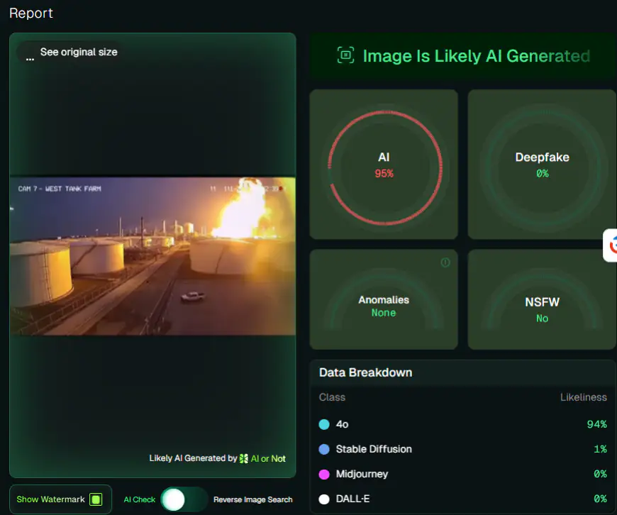 वीडियो की सूक्ष्म जांच करने पर इसमें कई ऐसी विसंगतियां पाई गईं जो केवल एआई-जनित सामग्री में ही संभव हैं। वीडियो की टाइमस्टैम्प्स पूरी तरह से अतार्किक हैं, जहाँ समय आगे बढ़ने के बजाय अचानक पीछे चला जाता है। इसके अलावा, धमाके के समय भागते हुए कर्मचारियों के शरीर की बनावट और उनकी हरकतें अवास्तविक नजर आ रही हैं। 'डीपफेक्स एनालिसिस यूनिट' (DAU) के अनुसार, 0:06 से 0:08 सेकंड के बीच रिफाइनरी के पाइपों का आकार रहस्यमयी तरीके से बदल रहा है और वे धुंधले या बिगड़े हुए दिख रहे हैं।