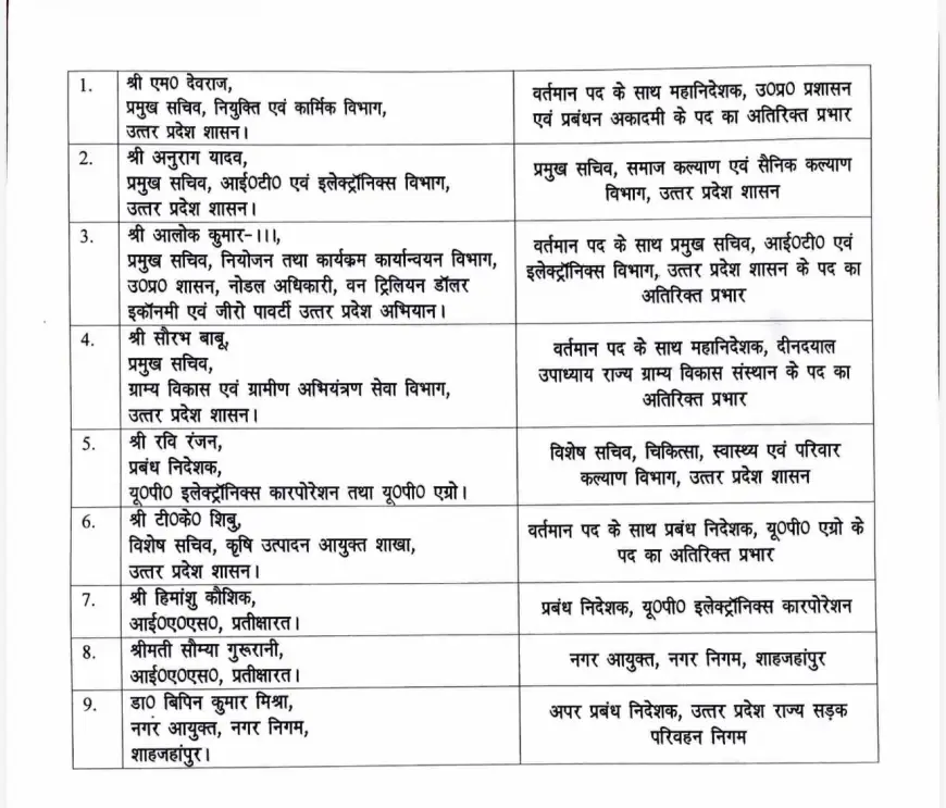 आईएएस अधिकारी एम. देवराज को प्रमुख सचिव, नियुक्ति एवं कार्मिक विभाग के साथ उत्तर प्रदेश प्रशासन एवं प्रबंधन अकादमी का महानिदेशक बनाया गया है। आईएएस अधिकारी अनुराग यादव को आईटी एवं इलेक्ट्रॉनिक्स विभाग से समाज कल्याण एवं सैनिक कल्याण विभाग का प्रमुख सचिव बनाया गया है। वहीं आलोक कुमार को आईटी एवं इलेक्ट्रॉनिक्स विभाग का अतिरिक्त प्रभार सौंपा गया है।