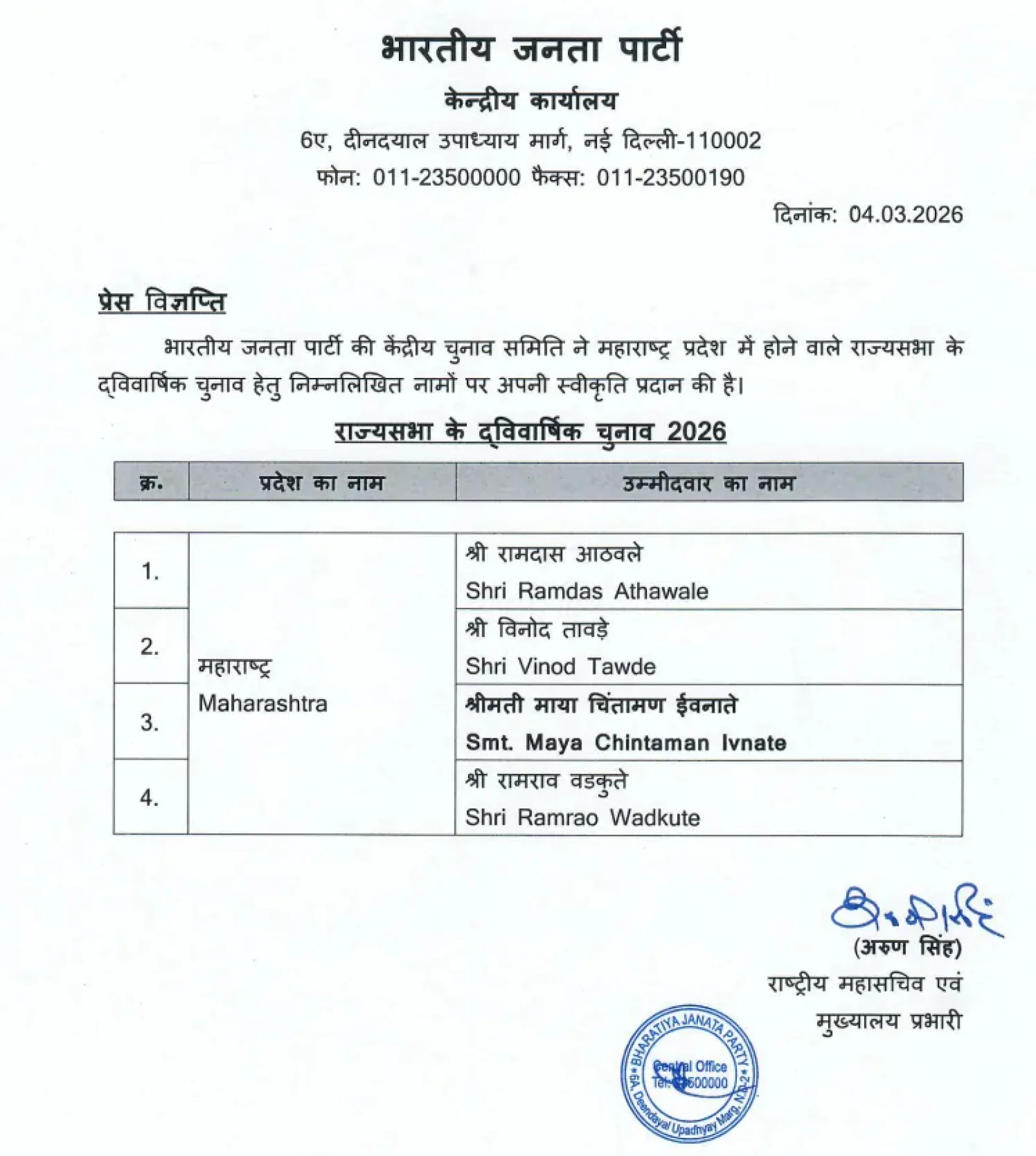 नई दिल्ली : भारतीय जनता पार्टी (भाजपा) ने महाराष्ट्र में राज्यसभा चुनाव के लिए अपने उम्मीदवारों के नाम की लिस्ट जारी कर दी है। भाजपा ने राष्ट्रीय महामंत्री विनोद तावड़े और केंद्रीय मंत्री रामदास अठावले समेत चार नेताओं को उम्मीदवार घोषित किया है।